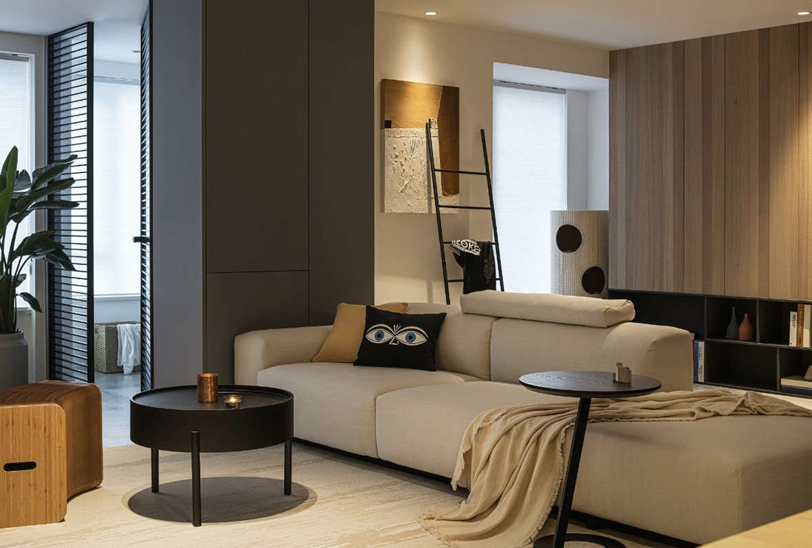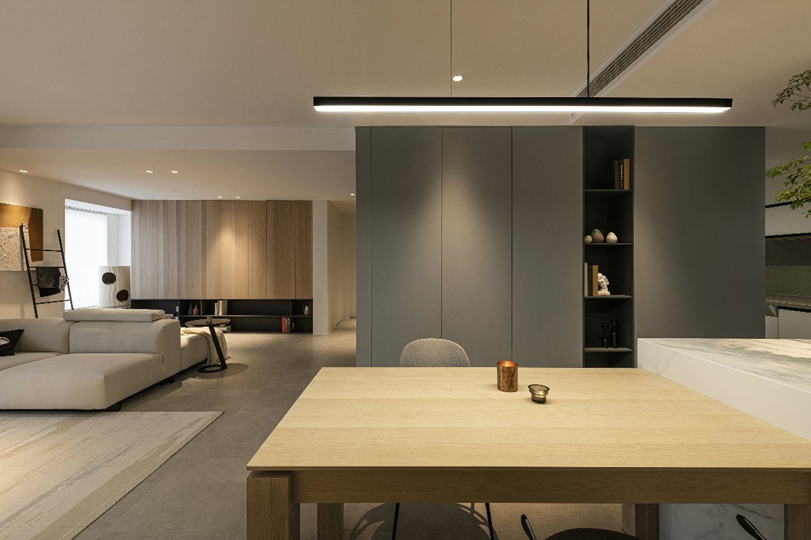整體色調以高級灰主,色彩獨有的視覺感賦予了空間沉穩且略顯冷靜的氣質,幾何造型的燈飾精致而大氣,沙發與桌椅線條感十足,不僅提升了客廳的藝術感,也為空間帶來了更加豐富的層次變化。深色的墻面和淺色的地毯利用線條勾勒空間,層次分明、以簡盛繁,低調而內斂。藝術品整齊地擺放于木制置物架上,常看的書籍也可以收納于此。