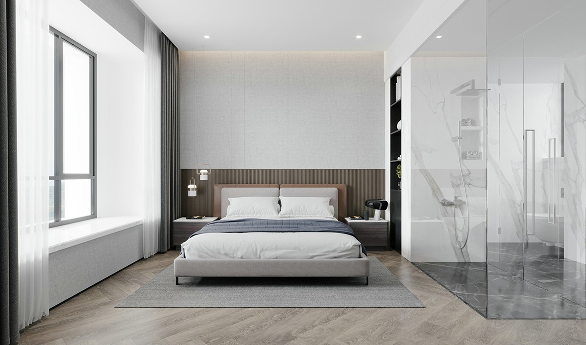 The design uses natural materials, the softest colors and the most authentic textures to express the simplest life. The chic linear chandelier creates a comfortable and elegant dining environment. The warm and rustic natural oak veneer complements the matte paint with its own cool breath, and is complemented by invisible light strips to enhance the atmosphere, outline the outline, and instantly enhance the hierarchy of the space. The dining room is designed on the side of the living room to make a whole guest dining room. The simplicity and purity of the restaurant area is just like the temperament of the owner himself. Pure space makes people feel peaceful and relaxed, remove impetuosity, and return to the essence of life.
