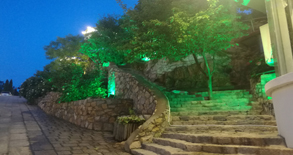 度假村園區(qū)局部亮化工程,采用綠色和暖色照樹(shù)燈從下晚上照亮樹(shù)木的同時(shí)打出美麗的光影效果,樓梯采用大功率暖色投影燈照射,施工出現(xiàn)效果期待整體完美效果。